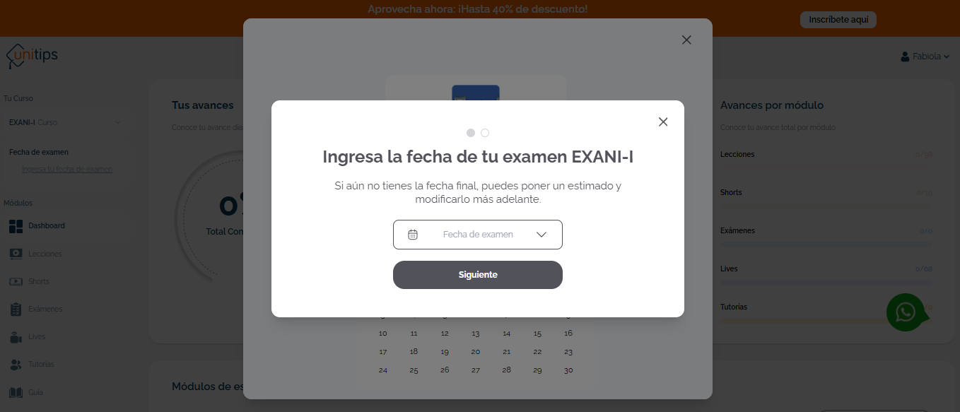 Inicia sesión en tu cuenta de Unitips, entra a tu curso y en la parte superior izquierda  encontraras "Fecha de examen" da clic en revisar