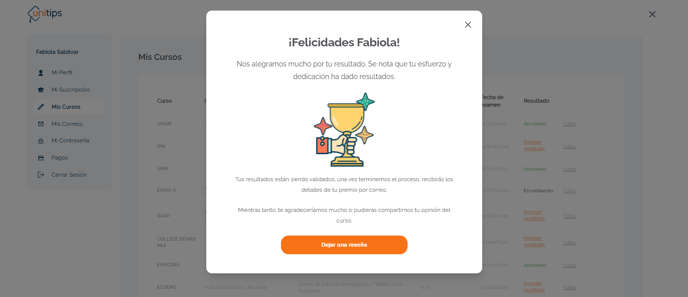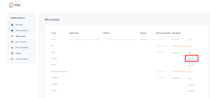 Ve al menú superior, haz clic en "Mi cuenta" y luego selecciona el ícono de tu perfil para acceder a la sección "Mis resultados".