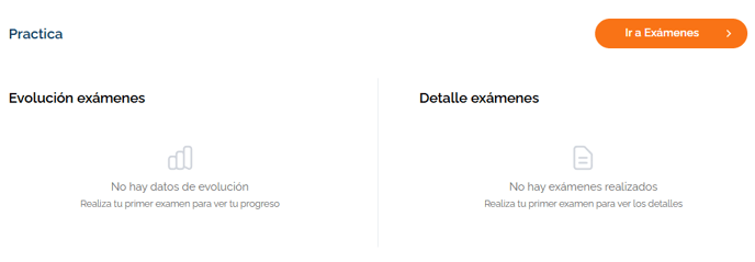 En el apartado Practica encontrarás un espacio dedicado a los exámenes diagnósticos disponibles en tu curso, la evolución de tus resultados representada en una gráfica y los detalles de cada uno de tus exámenes.