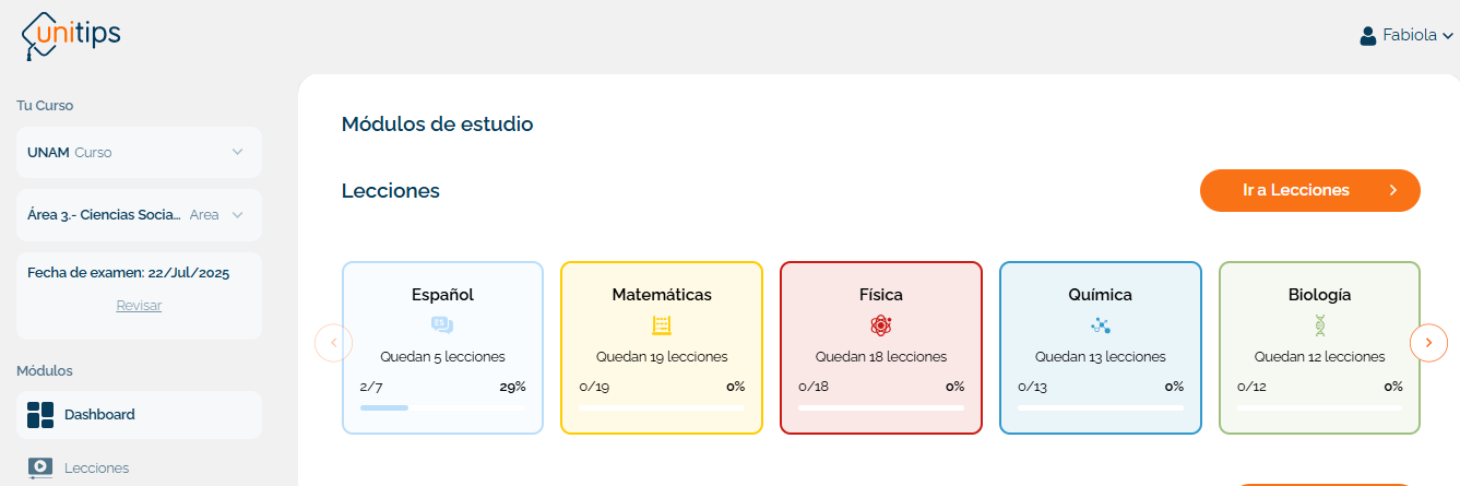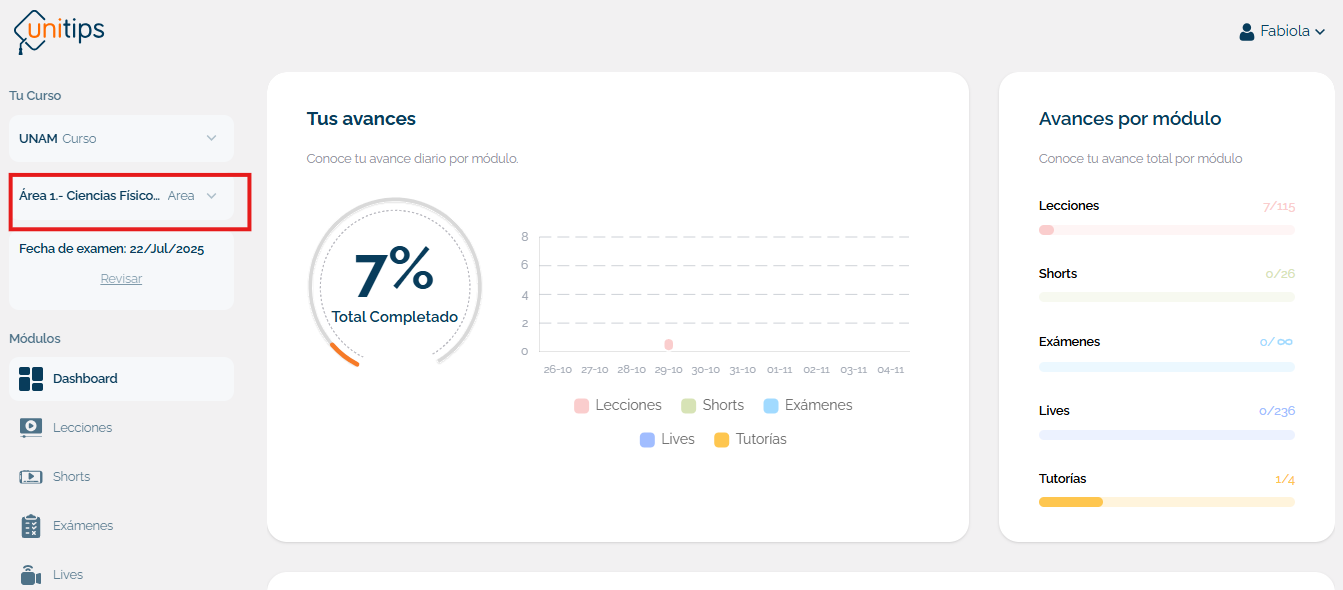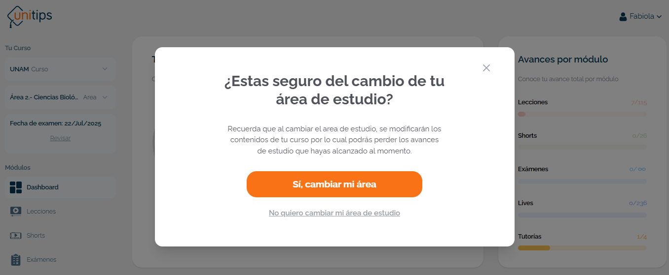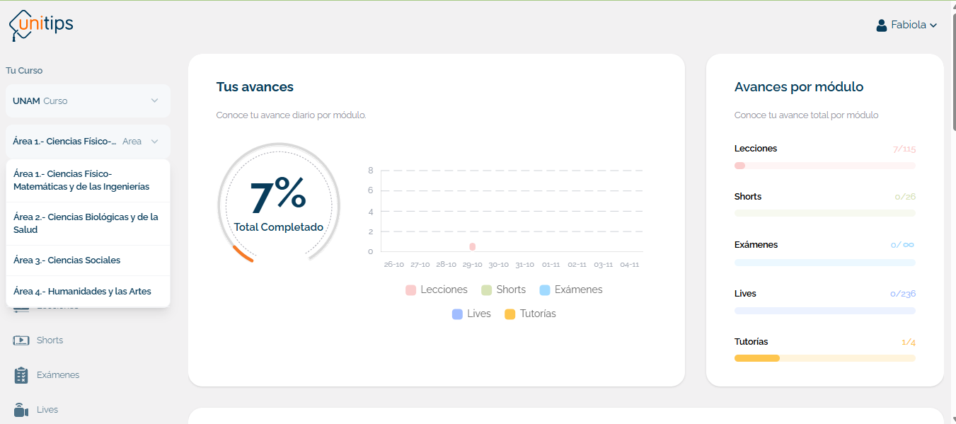 Al iniciar sesión con cualquiera de los planes de Unitips, selecciona el área que deseas estudiar para personalizar tu curso según el plan de estudios que necesitas repasar. Solo se mostrarán las materias relevantes para tu carrera. Asegúrate de elegir la opción correcta para aprovechar al máximo tu curso.