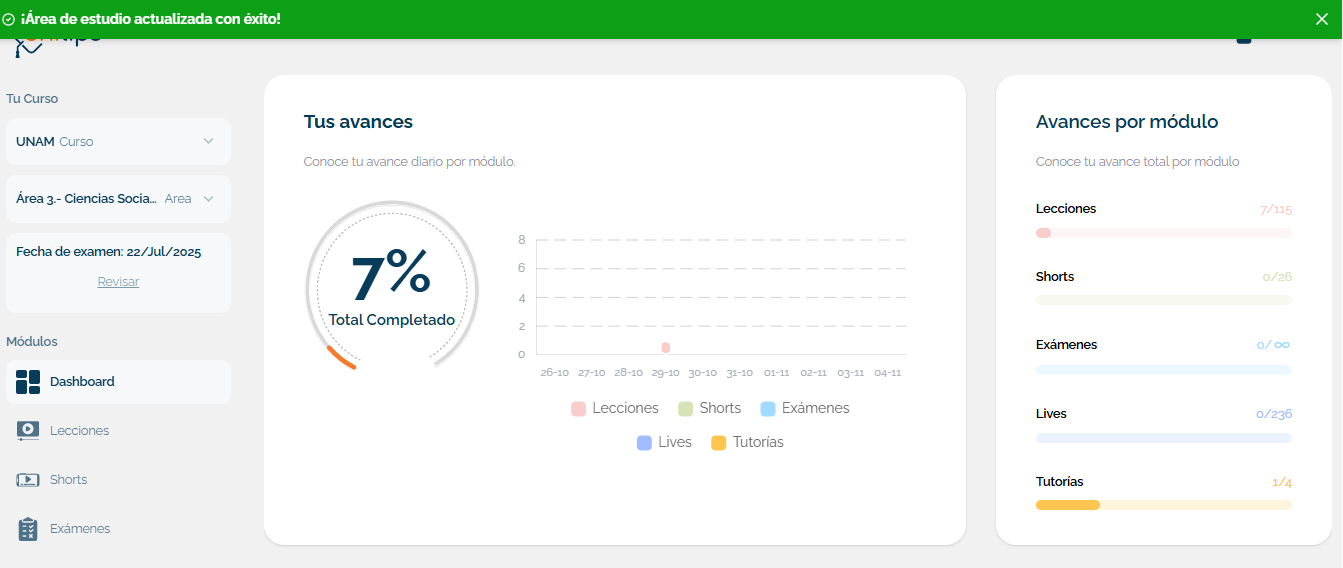 Notarás que, en la sección de Lecciones, solo aparecerán las materias correspondientes a la personalización que seleccionaste
